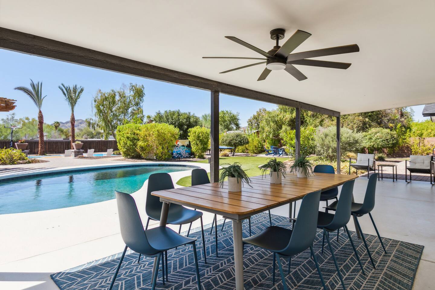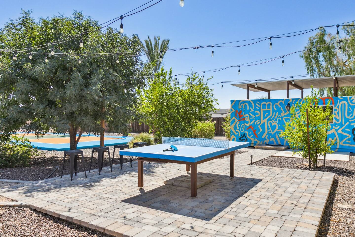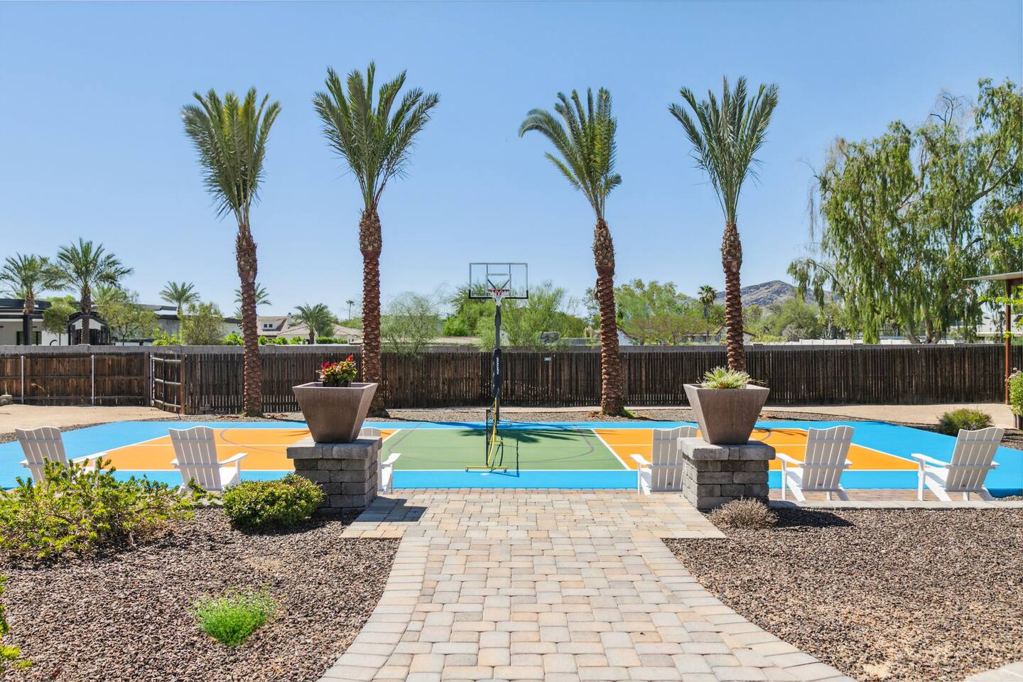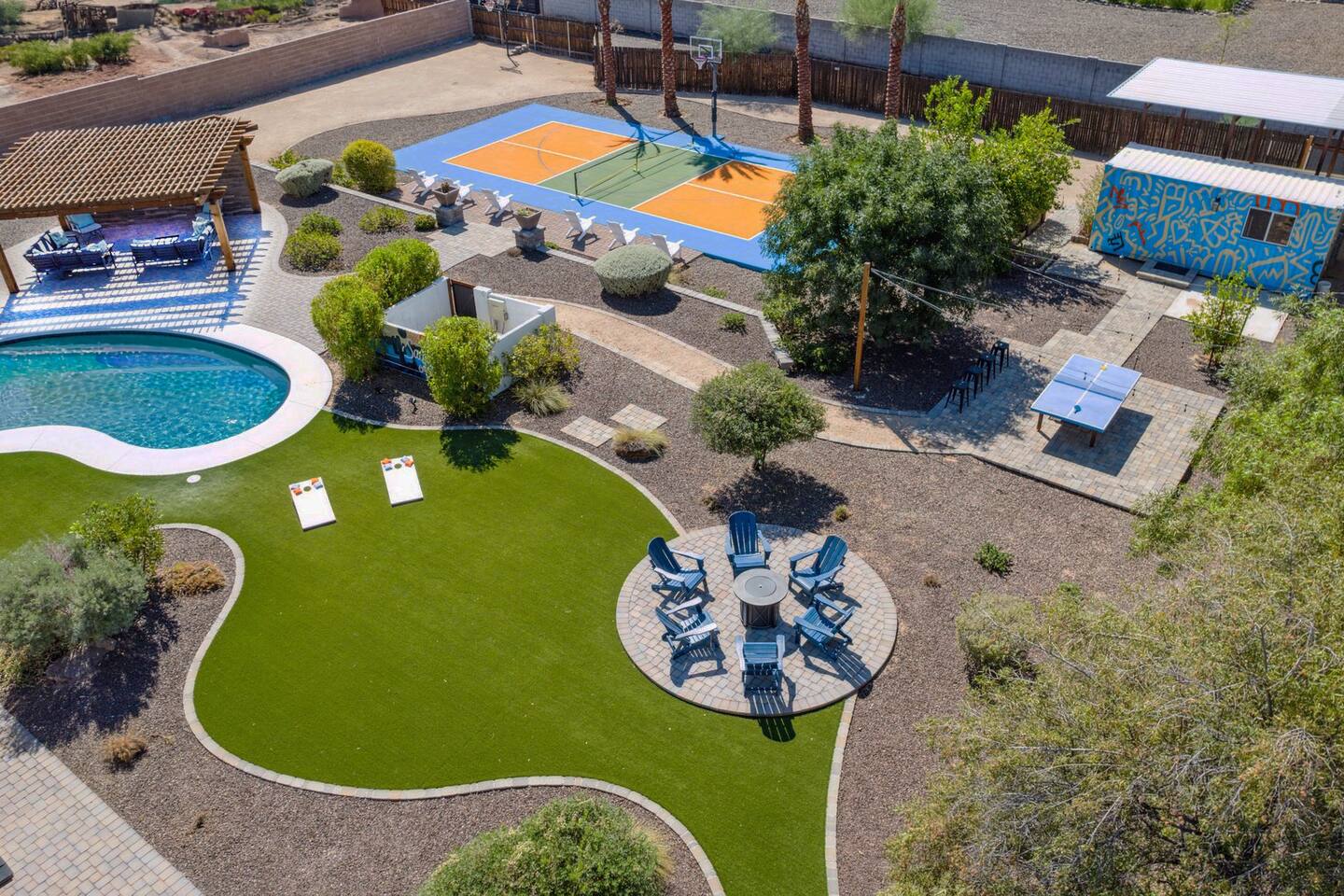 Sanctuary on Shea is a family friendly oasis located in Scottsdale. The property is geared towards allowing the whole family to enjoy all the sunshine Arizona has to offer! All game accessories are included with the property to enjoy * Private Pool - Child safety fence available for install upon request * Heated Pool - Available at $100/night * Hot tub * Pickleball court * Basketball court * Outdoor Ping Pong * Bocce Ball Court * Corn Hole *Horseshoe Toss * Yard Dice * Poolside Grill * Gas Firepit * Games The home is immaculately cleaned and includes all of the essentials to allow for a comfortable and enjoyable stay! Including but not limited to the items below: o Poolside Gas Grill o Cornhole Boards/Bags o All games accessories are provided o Outdoor patio table o Outdoor play area o Toaster o Drip Coffee Maker - filters and starter packs of coffee & creamer are provided o Microwave o Blender o Cooking Essentials o Pots & Pans o Silverware o Plates, Bowls, Glasses etc. o Washer/Dryer o Detergent o Board Games o Iron o Hangers o Hair Dryer o Shampoo, Conditioner and Body Wash o Bed Linens o Extra pillows and Blankets o Family owned - nearby for immediate assistance if needed Primary 1 - King size bed Primary 2 - King size bed Bedroom 3 - King size bed Bedroom 4- King size bed Bedroom 5- Two full bunk beds *All bedrooms have an ensuite bathroom* PLEASE NOTE: Pool Heating is available for $100 per night of your reservation. The pool will be heated and ready to enjoy at our time of check in time Child safety pool fence available for installation during your stay. Minimum 7 day advance notice is needed prior to your check in date House is monitored with exterior cameras for guest safety and security Please contact Heather, our property manager at Arizona RnR Vacation Rentals, for any additional questions