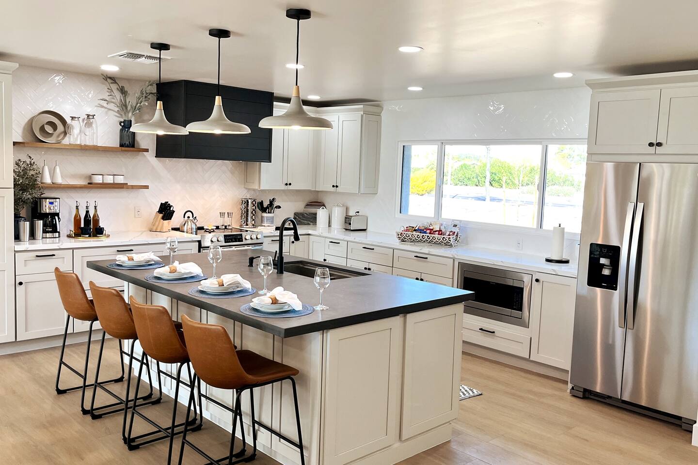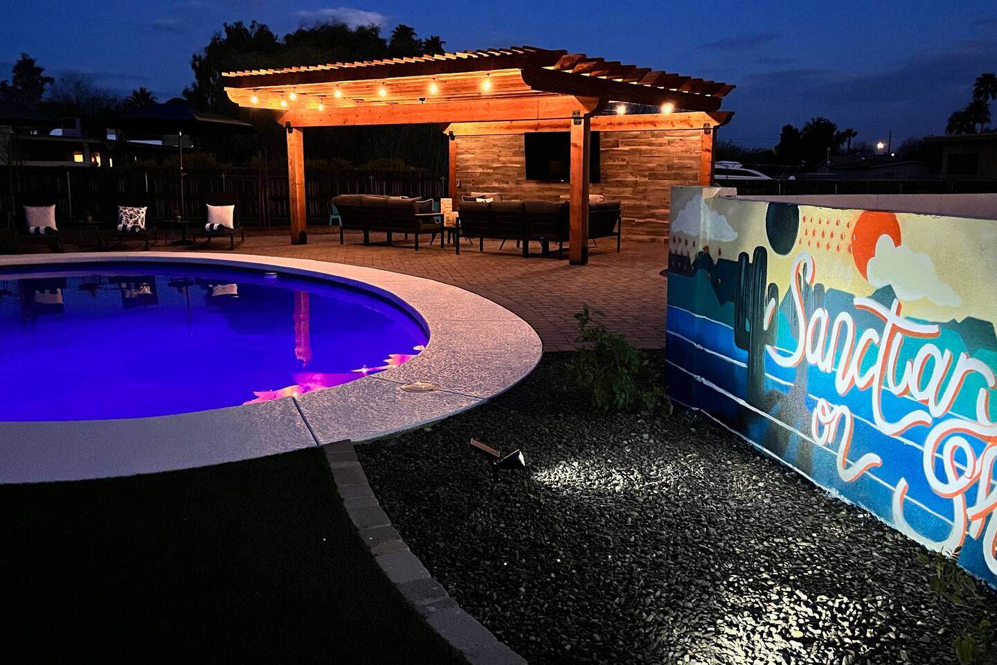 Sanctuary on Shea is a 5 bedroom/ 5 bath private home located on an acre lot. Brand new pickleball, basketball court, and hot tub were just added! The property features 2 primary bedrooms, 2 large dining areas, a covered gazebo with outdoor tv, heated pool, outdoor ping pong table, bocce court and so many games! Nearly one million dollars was put into renovating this amazing property. The sprawling backyard is stocked with fun for the whole family. You won't find any other property like it!